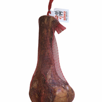 Our Mini Dino Bone is not so mini! Cut from a whole beef femur, with one of the knuckles removed, this mini bone is excellent for a pup who can handle the tendon and meaty chew. Great for dogs of all sizes. Pet supervision is recommended. Dog’s have sensitive stomachs, and we always recommend moderation when first introducing a new treat to their diet.